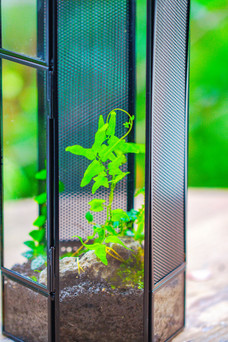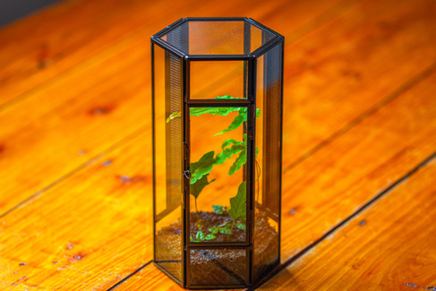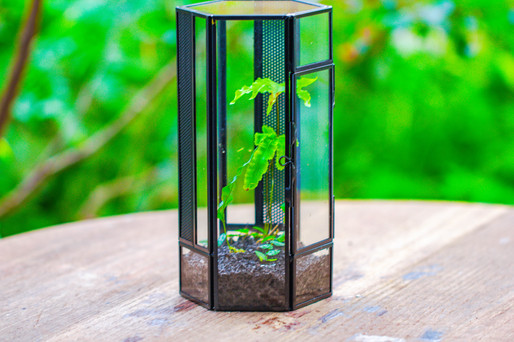a hexagon vented terrarium planted in moss and wild fern