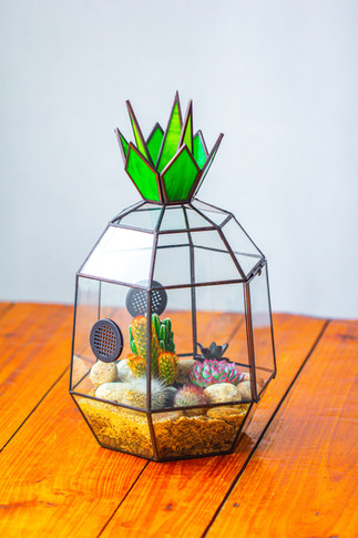 This pineapple shape geometric terrarium has a removable top and a vented body.