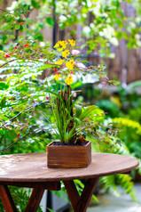 Planter: A wooden planter, made of paulownia wood, with a side length of 15 cm and a plastic liner.