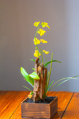Because the dancing-lady Orchid is relatively tall and soft, it tends to fall over. In this case, you need to use small clips—the kind that often come with orchids when you buy them, used to clip the flower stem to a wire support. Use these clips to fasten the orchid’s stem to the shrimp wood. Here, the shrimp wood functions as a support structure.