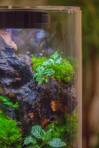 This is a super simple terrarium: The driftwood is glued on the cylinder terrarium with aquarium foam. Then a layer of red clay applied.