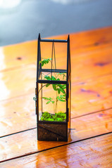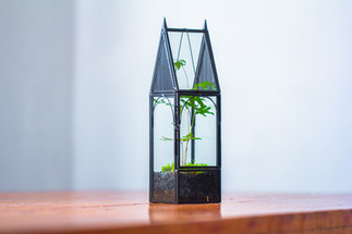 This is a mini gothic house shape terrarium. It is small and tall. A hand can hold it.