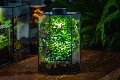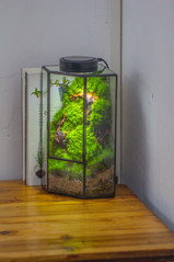Those moss terrarium are easy to build and maintenance. I have the light always on and it function as a night light on my table. It is such a pleasure to see it every time I walk by.